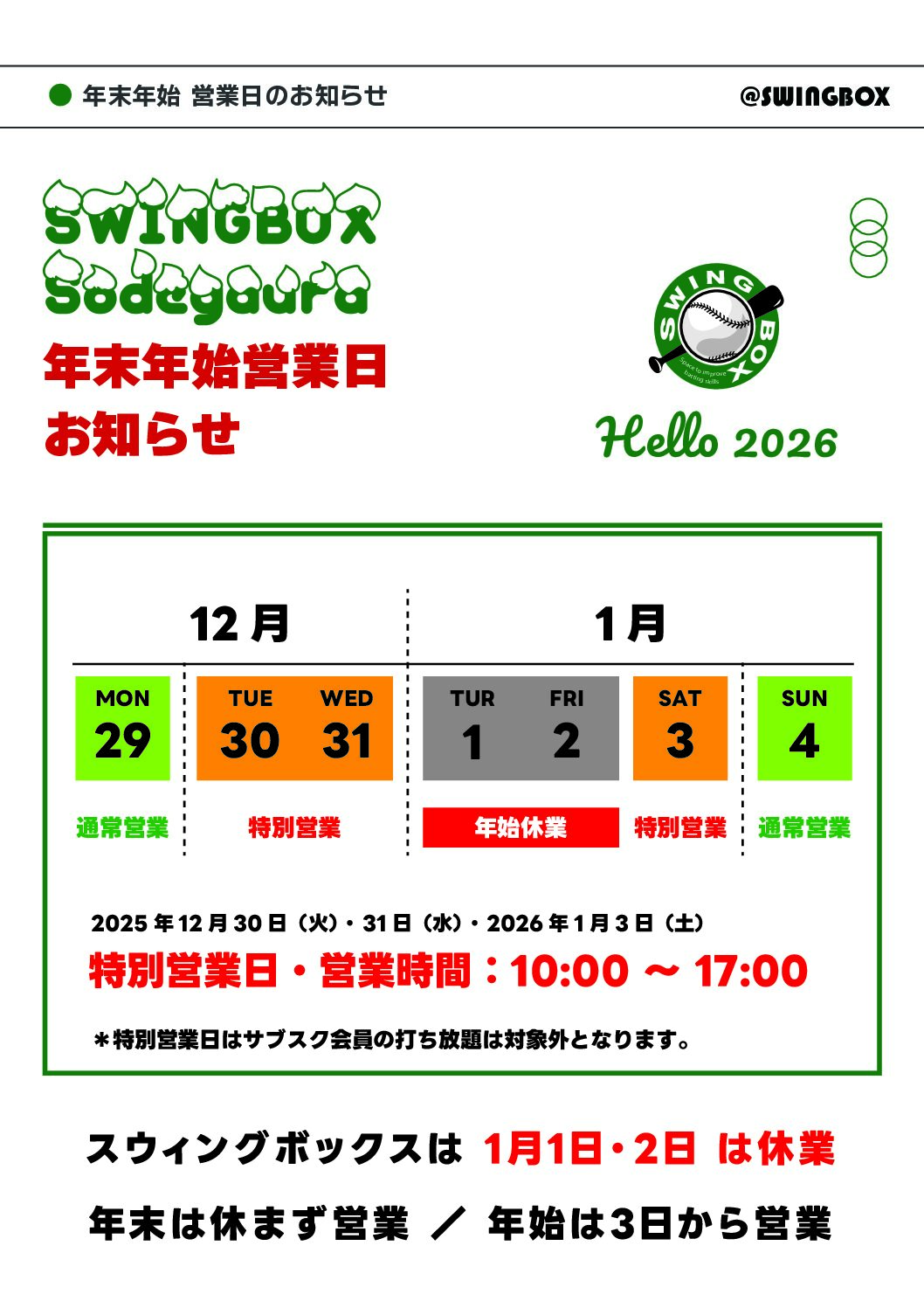 本年も多くのお客様にスウィングボックス袖ヶ浦店をご利用いただき、誠にありがとうございます。年末年始の営業日についてご案内いたします。